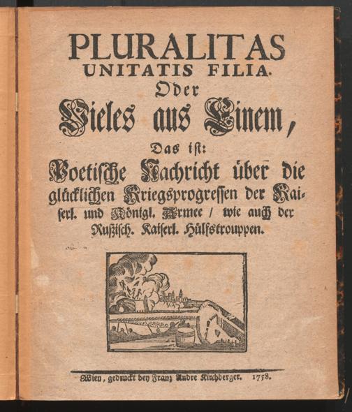 Pluralitas unitatis filia oder Vieles aus Einem : Das ist: Poetische Nachricht über die glücklichen Kriegsprogressen der kaiserl. und königl. Armee, wie auch der rußisch. kaiserl. Hülfstrouppen. Wien : F.A. Kirchberger, 1758. Wienbibliothek im Rathaus, A-10980, https://resolver.obvsg.at/urn:nbn:at:AT-WBR-1383131 / Public Domain Mark 1.0
