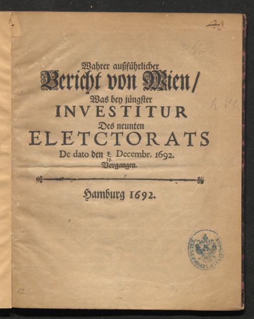 Wahrer außführlicher Bericht von Wien, was bey jüngster Investitur des neunten Eletctorats de dato den 9./19. Decembr. 1692 vorgangen. Hamburg, 1692. Wienbibliothek im Rathaus, A-11468, https://resolver.obvsg.at/urn:nbn:at:AT-WBR-1383442 / Public Domain Mark 1.0