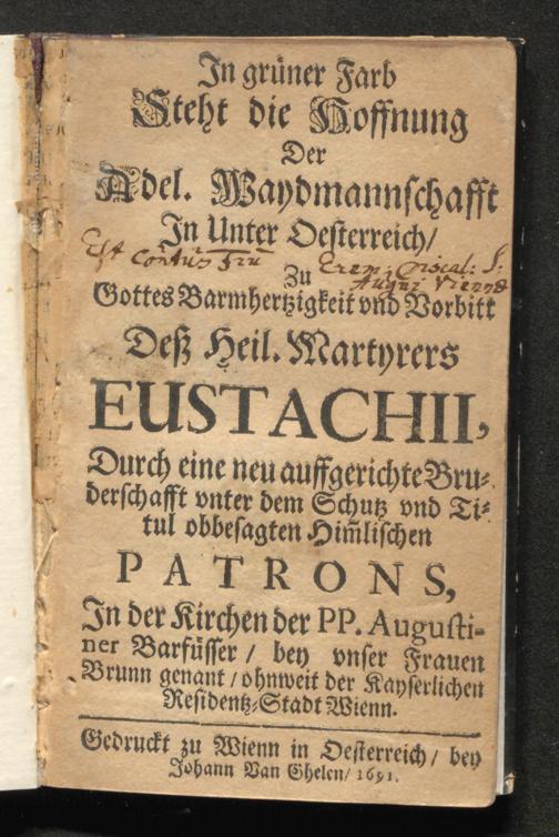 In grüner Farb Steht die Hoffnung Der Adel. Waydmannschafft In Unter Österreich, Zu Gottes Barmherzigkeit und Vorbitt Deß Heil. Martyrers Eustachii Durch eine neu auffgerichte Bruderschafft unter dem Schutz und Titul obbesagten Himmlischen Patrons, In der Kirchen der PP. Augustiner Barfüsser, bey unser Frauen Brunn genant, ohnweit der Kayserlichen Residentz-Stadt Wienn
