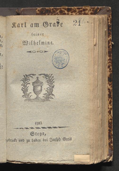 Karl am Grabe seiner Wilhelmine. Steyr : gedruckt und zu haben bei Joseph Greis, [s.a. ca. 1820]. Wienbibliothek im Rathaus, A-21961, https://resolver.obvsg.at/urn:nbn:at:AT-WBR-1386291 / Public Domain Mark 1.0