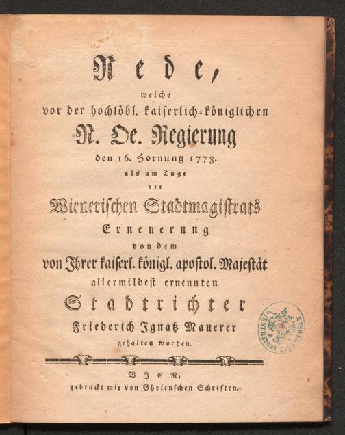 Rede, welche vor der hochlöbl. kaiserlich-königlichen N.Oe. Regierung den 16. Hornung 1773. als am Tage der wienerischen Stadtmagistrats Erneuerung / von dem von Ihrer kaiserl. königl. apostol. Majestät allermildest ernennten Stadtrichter Friedrich Ignatz Mauerer gehalten worden. Wien : Ghelen, 1773. Wienbibliothek im Rathaus,