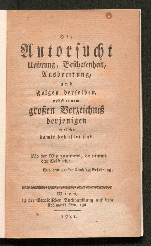 Die Autorsucht Ursprung, Beschafenheit, Ausbreitung, und Folgen derselben : nebst einem großen Verzeichniß derjenigen welche damit behaftet sind. Wien : in der Geroldischen Buchhandlung, 1781. Wienbibliothek im Rathaus, A-15409, https://resolver.obvsg.at/urn:nbn:at:AT-WBR-1563669 / Public Domain Mark 1.0