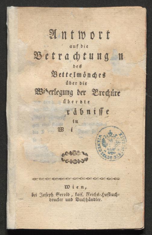 Antwort auf die Betrachtungen des Bettelmönches über die Widerlegung der Brochüre über die Begräbnisse in Wien / [Patricius Fast]. Wien : bei Joseph Gerold, 1781. Wienbibliothek im Rathaus, A-11229, https://resolver.obvsg.at/urn:nbn:at:AT-WBR-1565525 / Public Domain Mark 1.0