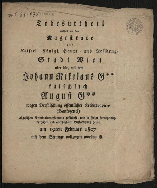 - TitelTodesurtheil welches von dem Magistrate der Kaiserl. Königl. Haupt- und Residenz-Stadt Wien über die, mit dem Johann Nikolaus G** fälschlich August G** wegen Verfälschung öffentlicher Kreditspapiere (Bankozettel) abgeführte Kriminaluntersuchung geschöpft : und in Folge herabgelangter hohen und allerhöchsten Bestättigung heute am 19ten Februar 1807 mit dem Strange vollzogen worden ist