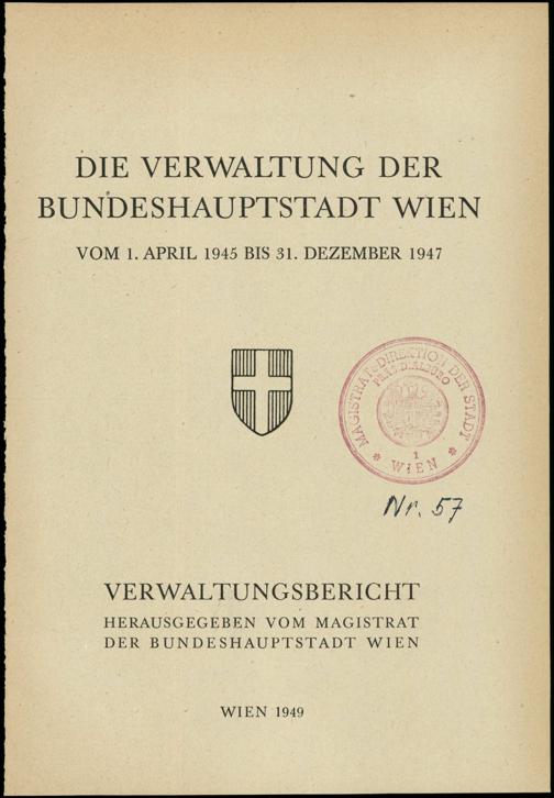 Die Verwaltung der Stadt Wien : Berichtsjahr ... / hrsg. vom Magistrat der Stadt Wien. Red.: Statistisches Amt der Stadt Wien. Wien : Magistrat d. Stadt Wien, 1945/47 - 1950/51; 1970(1971) - 2001(2002), 1945-2002. Wienbibliothek im Rathaus, A-132113, https://resolver.obvsg.at/urn:nbn:at:AT-WBR-45606 / Public Domain Mark 1.0