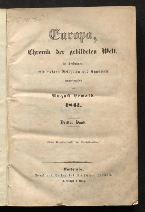 A. Lewald's Europa : Chronik der gebildeten Welt / in Verb. mit mehren Gelehrten und Künstlern hrsg. von August Lewald. Karlsruhe ; Baden : Gutsch u. Rupp ; Leipzig ; Stuttgart : Scheible ; Karlsruhe : Artistisches Inst., 1835 - 1844, 1835-1844. Wienbibliothek im Rathaus, A-19564, https://resolver.obvsg.at/urn:nbn:at:AT-WBR-1010911 / Public Domain Mark 1.0