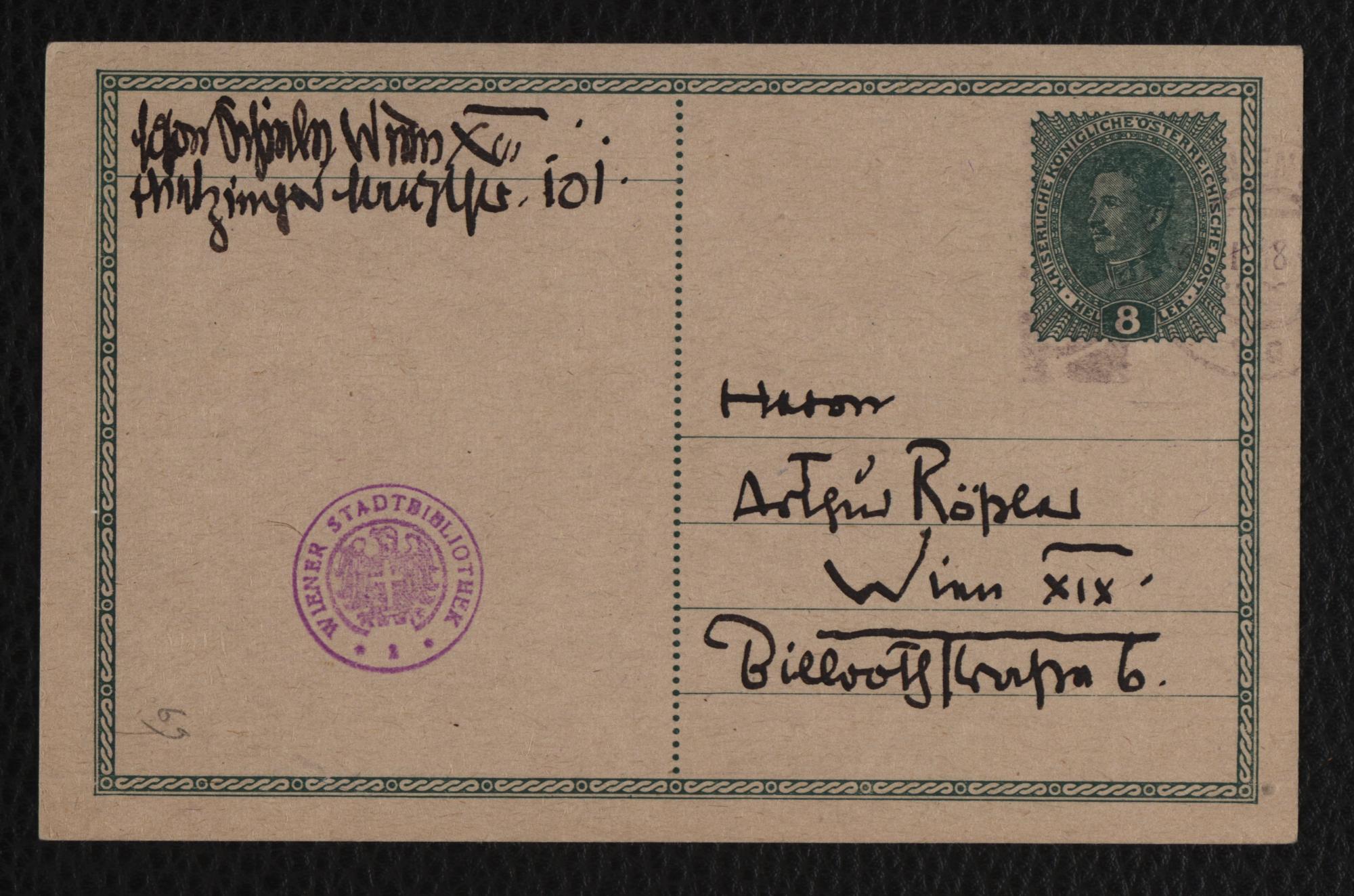 Korrespondenzkarte an Arthur Roessler