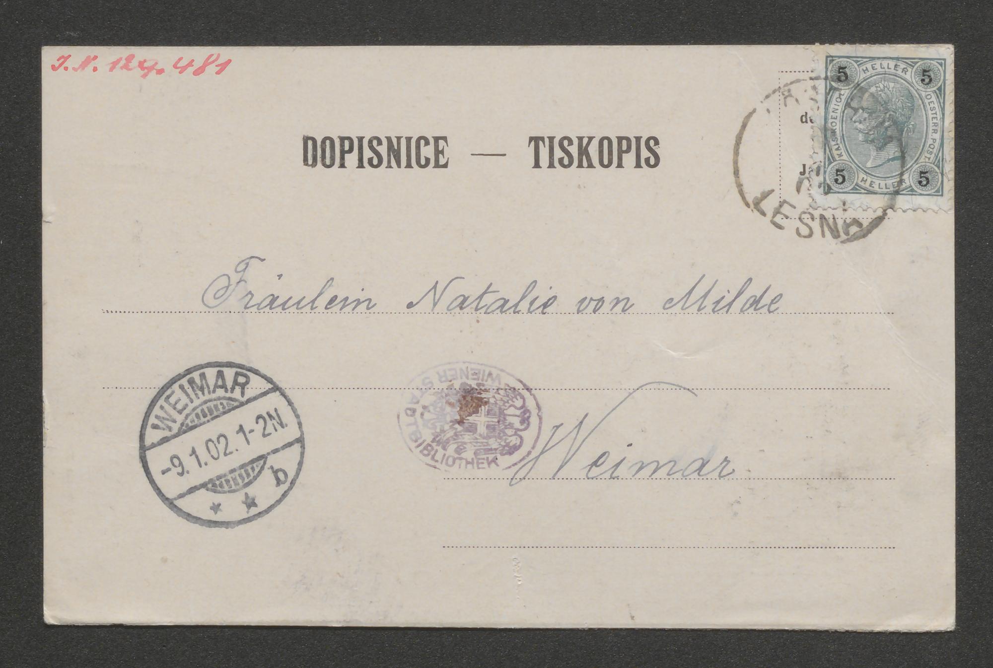 Postkarte an Natalie von Milde