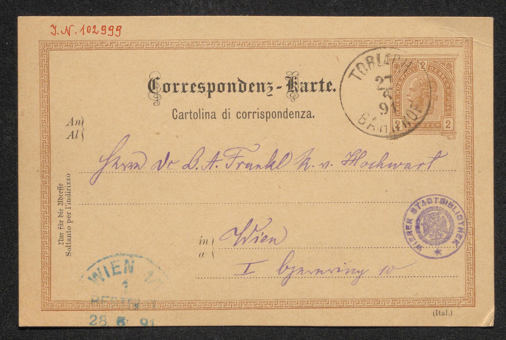 Korrespondenzkarte an Ludwig August Frankl von Hochwart