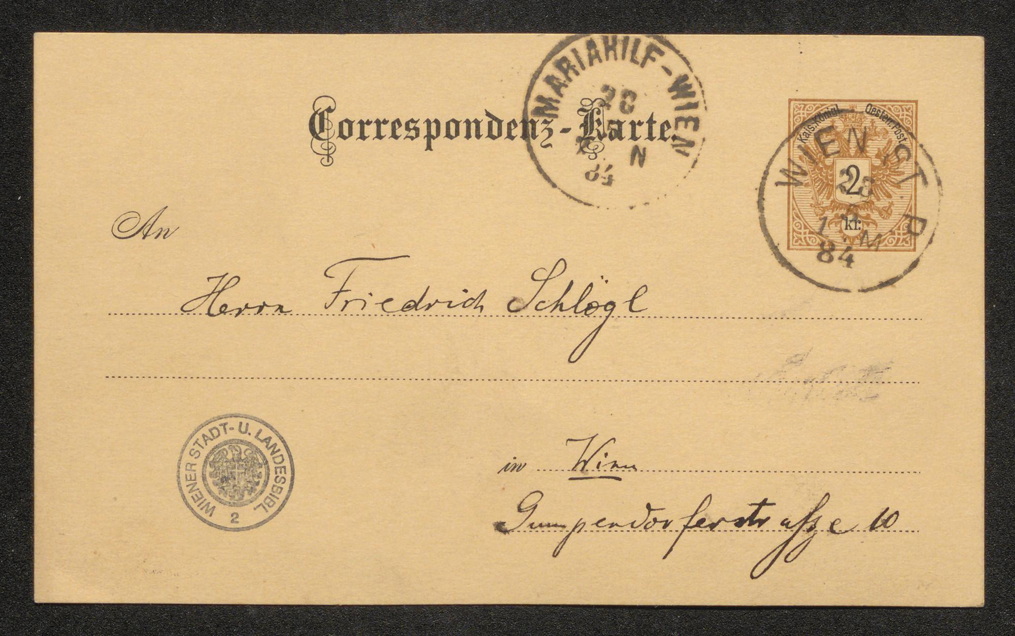 Korrespondenzkarte an Friedrich Schlögl
