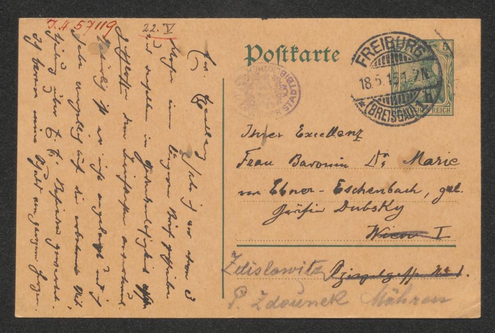 Korrespondenzkarte an Marie von Ebner-Eschenbach