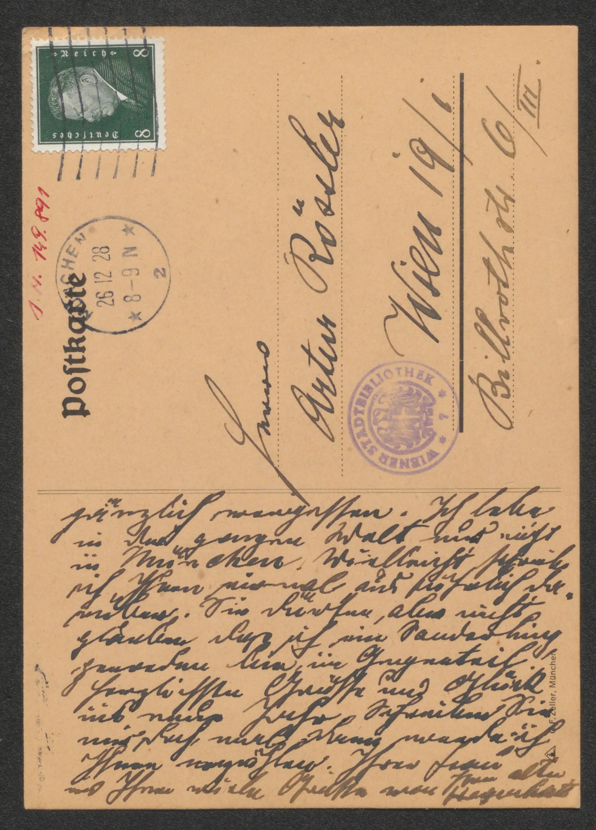 Postkarte an Arthur Roessler