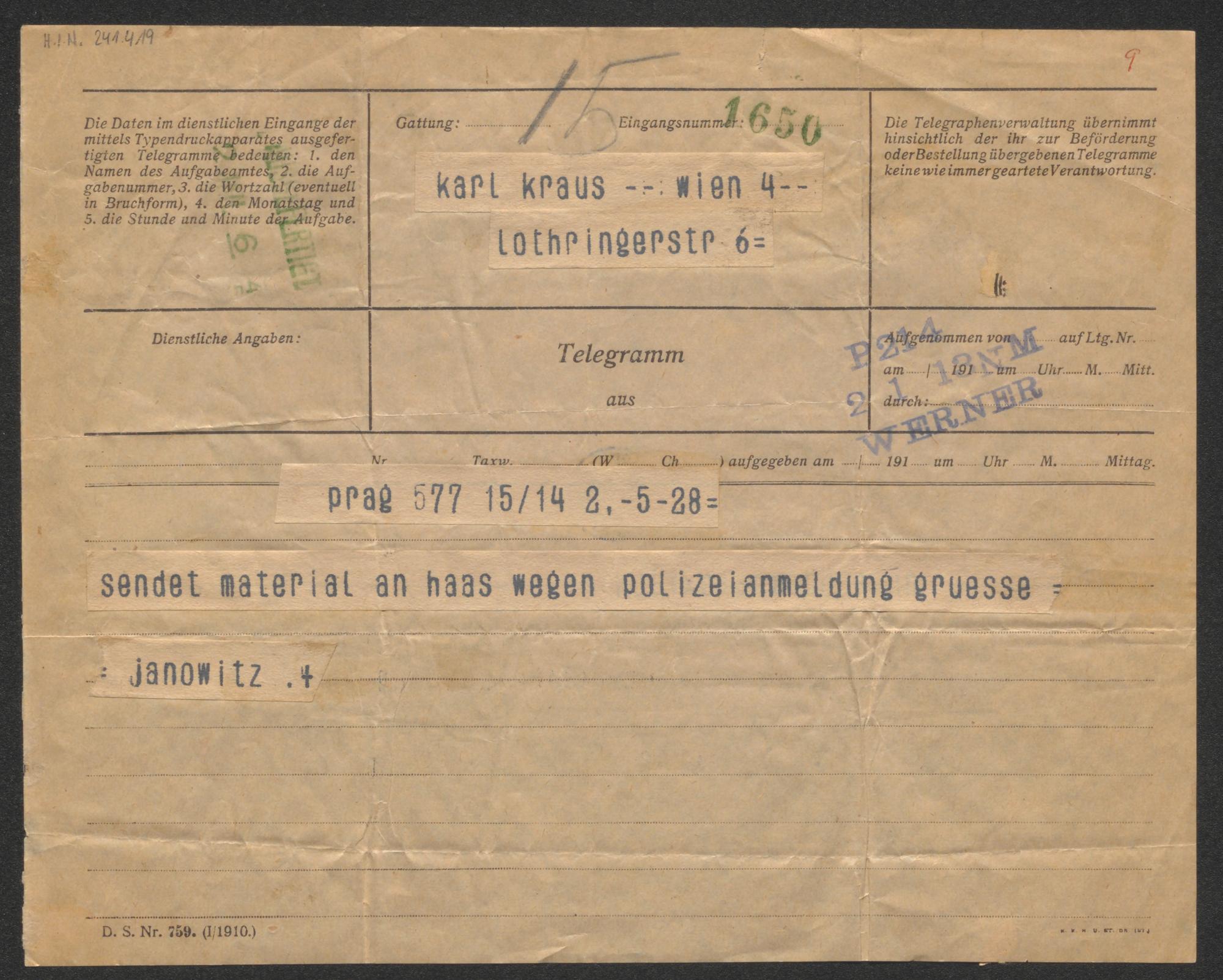 Telegramm an Karl Kraus