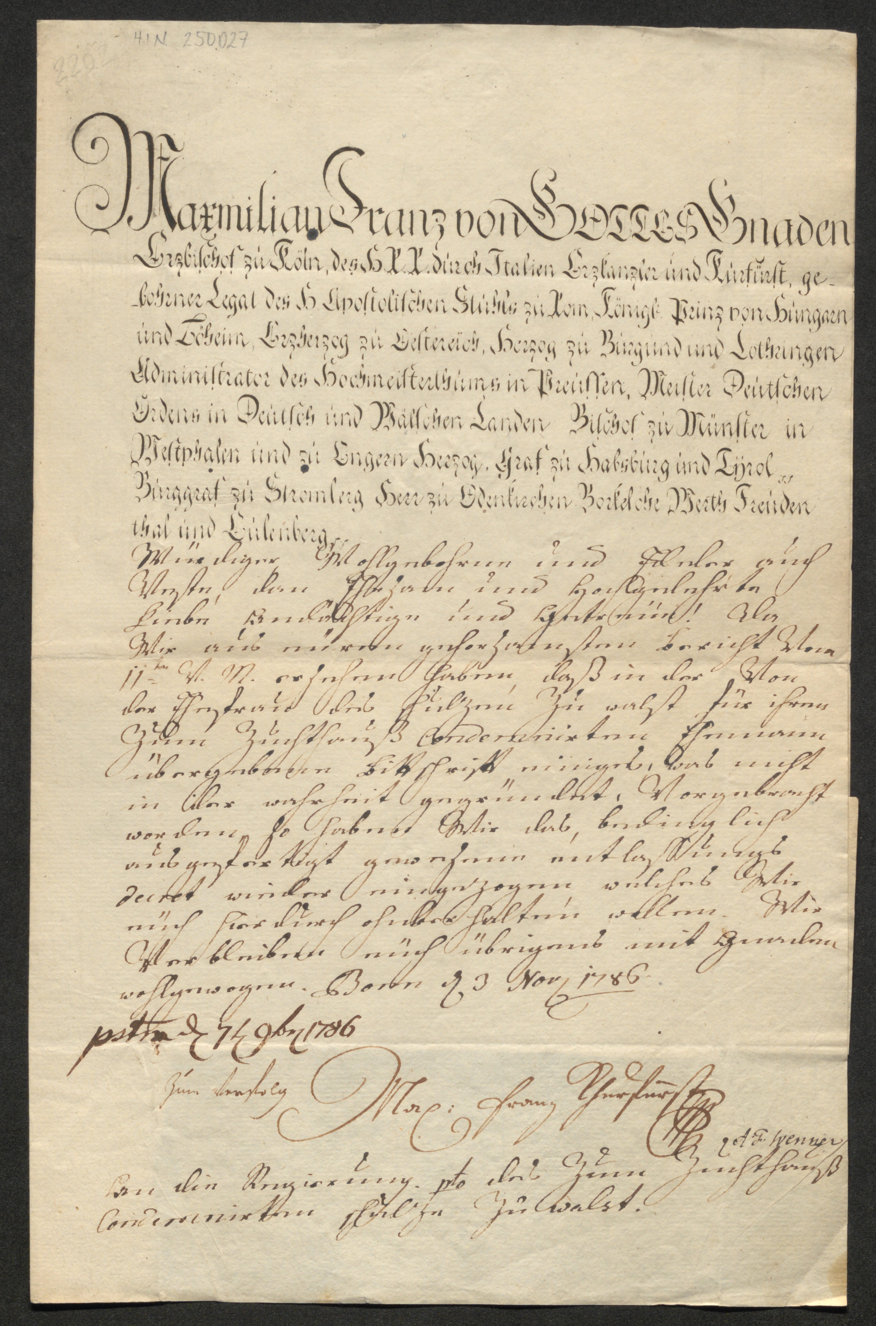 Schreiben von Maximilian Franz, Erzbischof von Köln, an die Regierungsvertreter des Erzstifts Köln in Münster