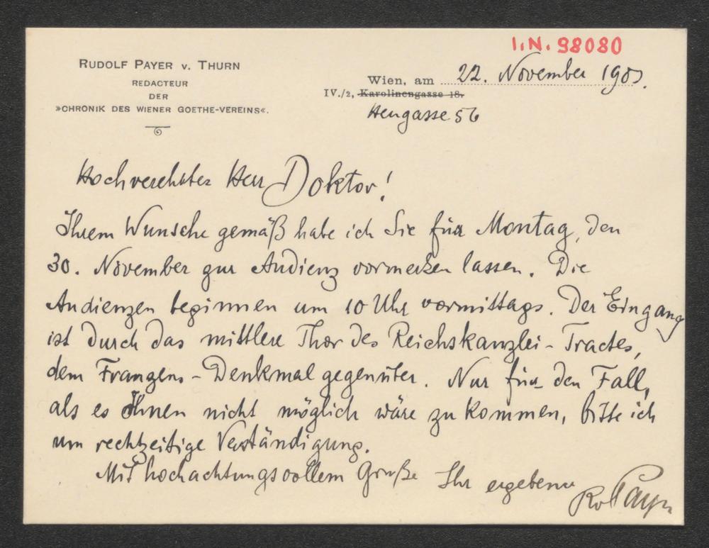 Billett an Richard von Kralik
