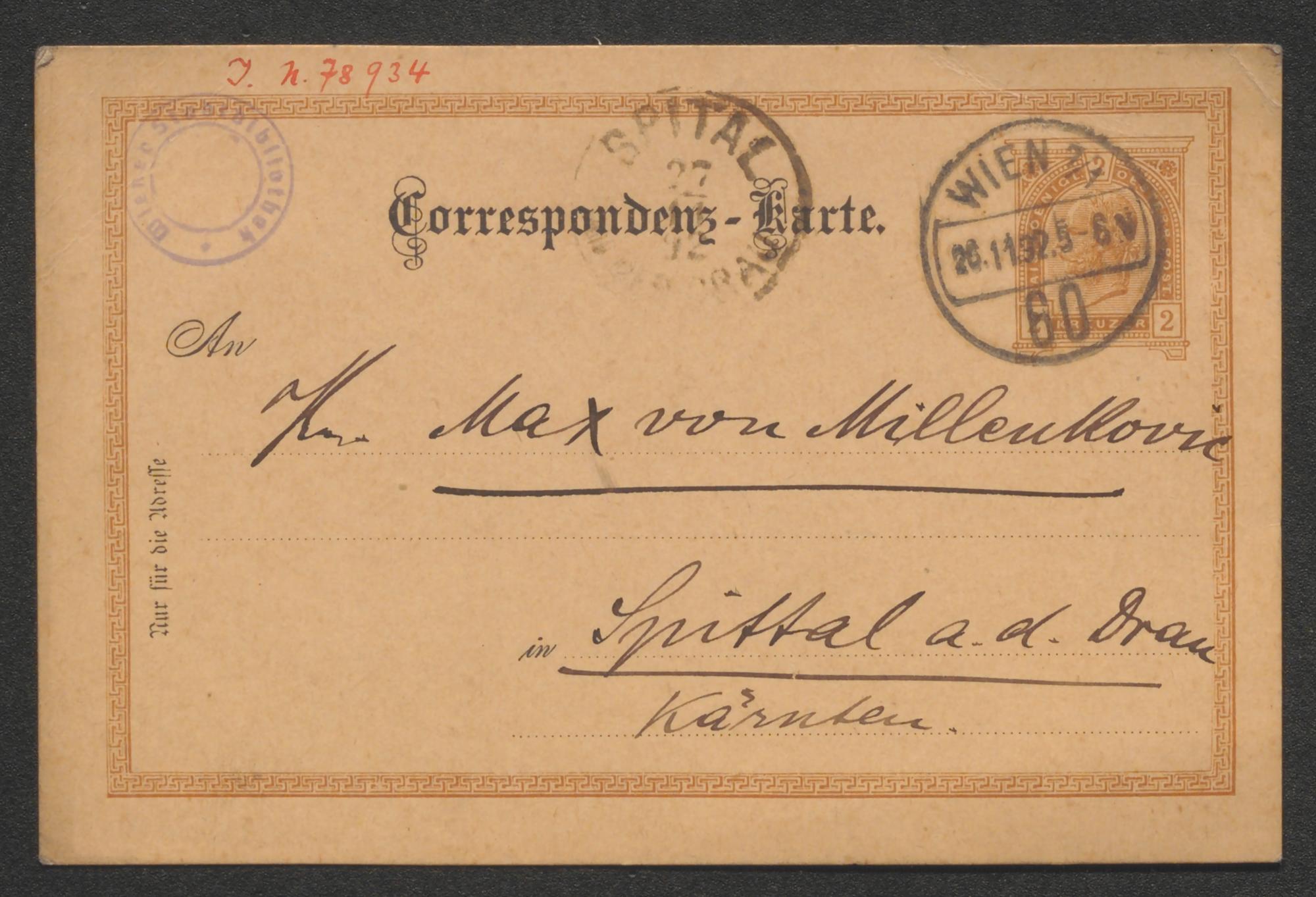Postkarte an Max von Millenkovich-Morold
