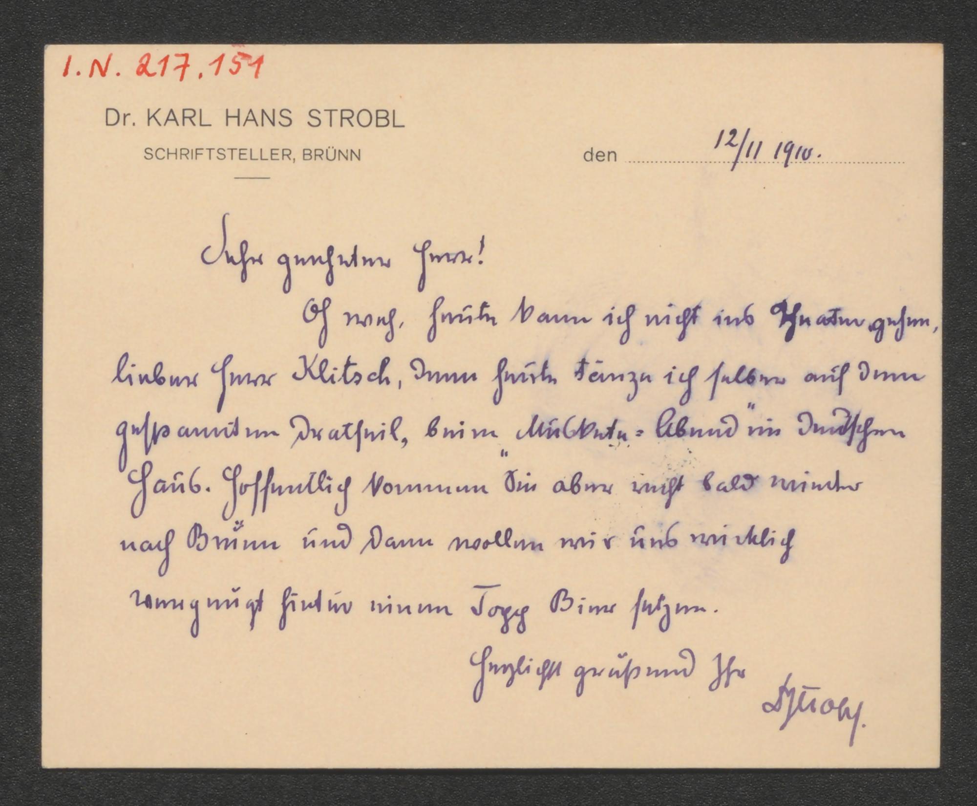 Briefbillett an Wilhelm Klitsch