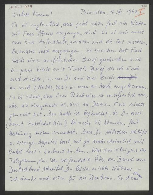 Gödel, Kurt: Brief an Marianne Gödel. Princeton, NJ, 10.11.1962