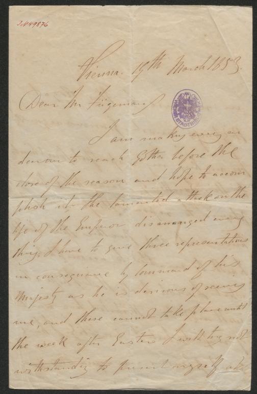Aldridge, Ira Frederick: Brief an ... Jugsmann. Wien, 19.3.1853