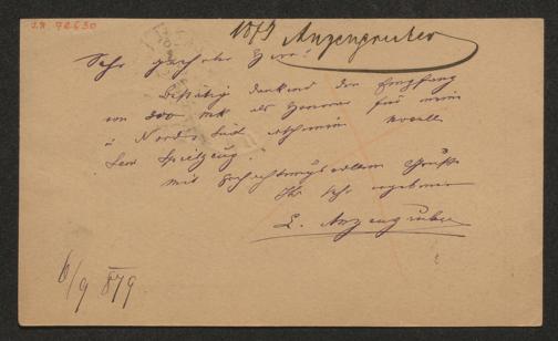 Anzengruber, Ludwig: Korrespondenzkarte an Salomon Schottländer. Marienbad, 6.9.1879. Wienbibliothek im Rathaus, H.I.N.-72630, https://resolver.obvsg.at/urn:nbn:at:AT-WBR-222225 / Public Domain Mark 1.0