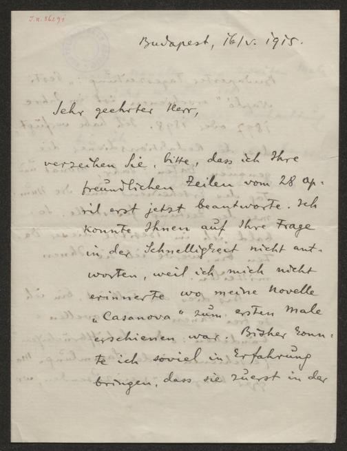 Ambrus, Zoltán: Brief an Gustav Gugitz. Budapest, 16.5.1915