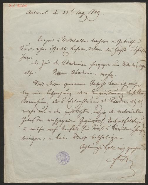 Amerling, Friedrich von: Antwort auf einer Einladung der Akademie der Bildenden Künste. o.O., 22.8.1849. Wienbibliothek im Rathaus, H.I.N.-100699, https://resolver.obvsg.at/urn:nbn:at:AT-WBR-226040 / Public Domain Mark 1.0