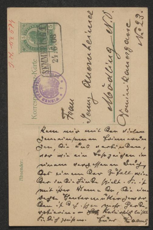 Auernheimer, Raoul: Postkarte an Jenny Auernheimer. Semmering, 24.6.1908