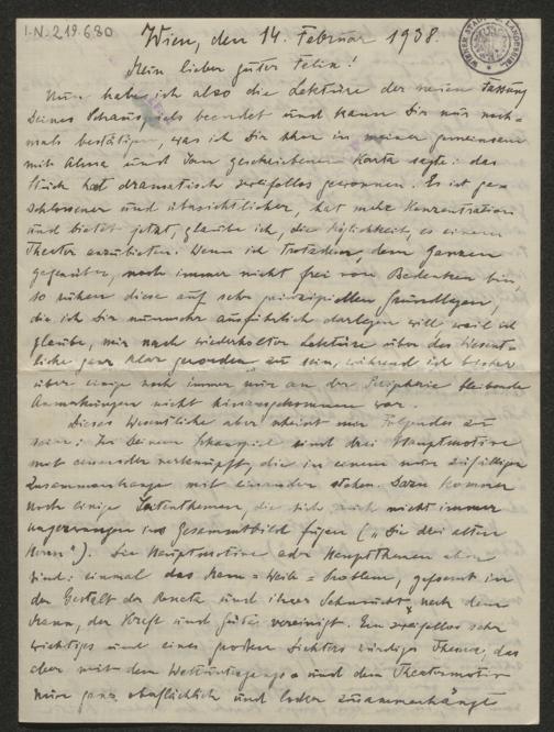 Antoine, Eugen: Brief an Felix Braun. Wien, 14.2.1938