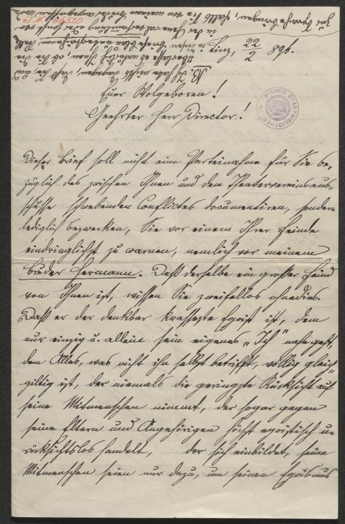 Bahr, Otto: Brief an Adam Müller-Guttenbrunn. Linz, 22.2.1896