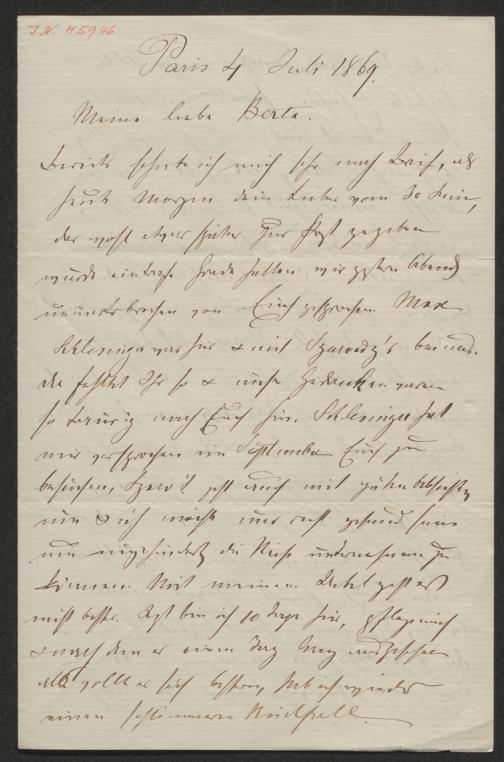 Bamberger, Ludwig: Brief an Bertha Hartmann. Paris, 4.7.1869