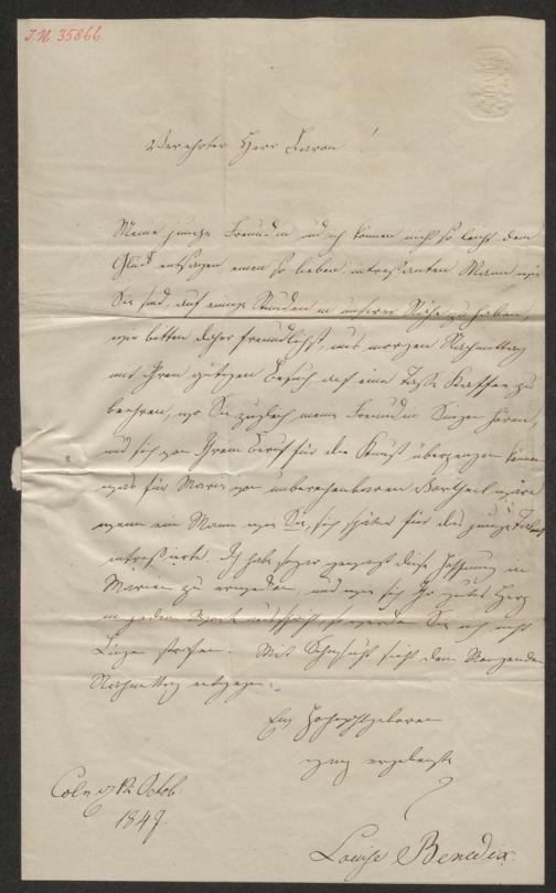 Benedix, Maria Ludovica: Brief an Franz von Schober. Köln, 12.10.1847
