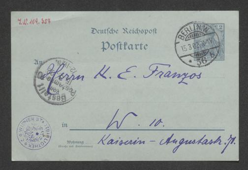 Etzel, Gisela: Postkarte an Karl Emil Franzos. Berlin, 15.3.1902