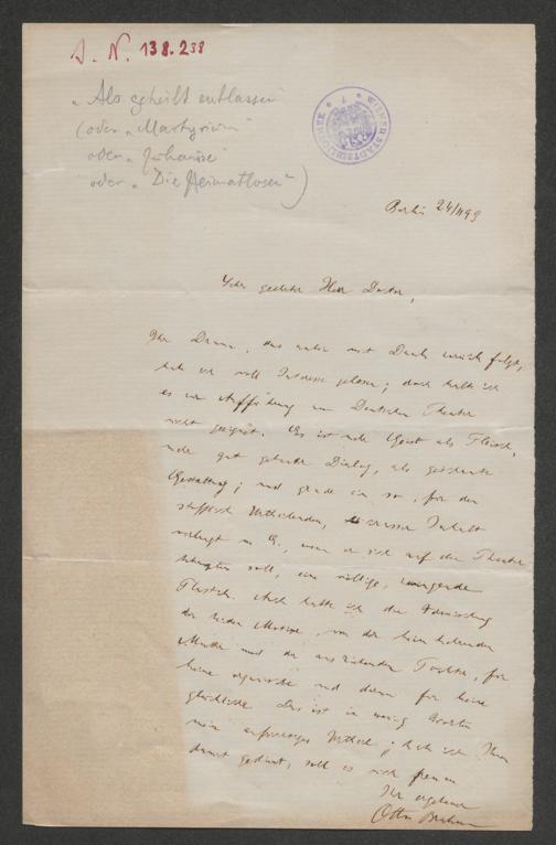 Brahm, Otto: Brief an Franz Servaes. Berlin, 24.11.1893
