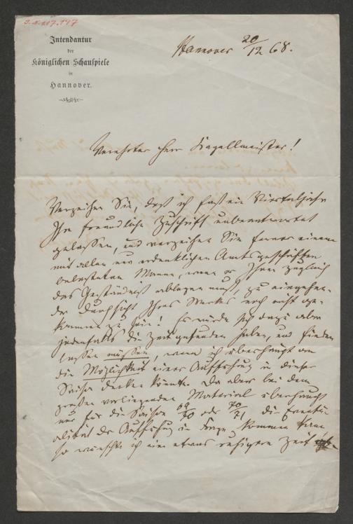 Bronsart von Schellendorf, Hans: Brief an Richard Genée. Hannover, 20.12.1868