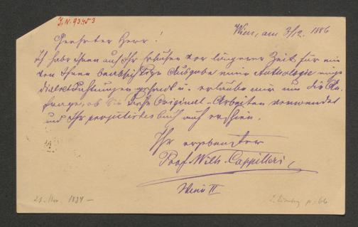 Cappilleri, Wilhelm: Korrespondnezkarte an Ernst Moser. Wien, 3.12.1886