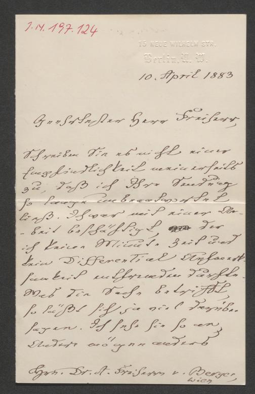 Du Bois-Reymond, Emil: Brief an Alfred von Berger. Berlin, 10.4.1883