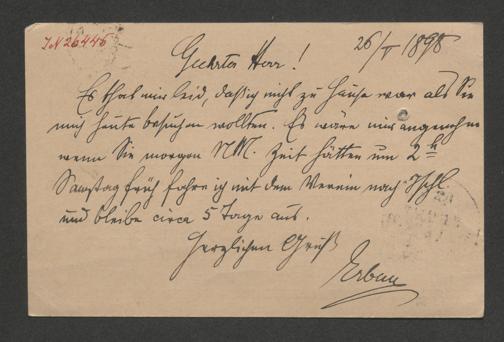 Erban, Franz: Korrespondenzkarte an Eduard Merkt. Wien, 26.5.1898