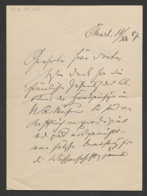 Bode, Wilhelm: Brief an Unbekannt. Charlottenburg, 18.12.1907