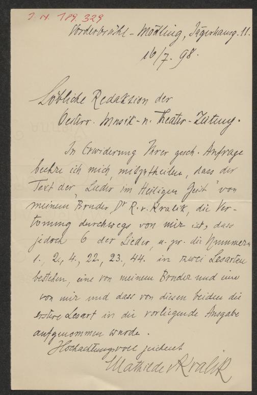 Kralik, Mathilde von: Brief an die Redaktion der Österreichischen Musik und Theater-Zeitung. Vorderbrühl, 16.7.1898. Wienbibliothek im Rathaus, H.I.N.-189329, https://resolver.obvsg.at/urn:nbn:at:AT-WBR-553682 / Public Domain Mark 1.0