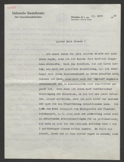 Busch, Fritz: Brief an Ernst Krenek. Dresden, 25.3.1924