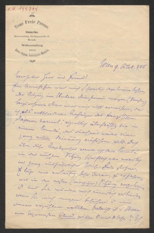 Hanslick, Eduard: Brief an Eduard Kremser. Wien, 9.10.1885