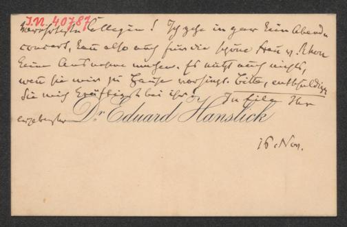 Hanslick, Eduard: Visitenkarte an Hedwig Abel. o.O., °°°°.11.16