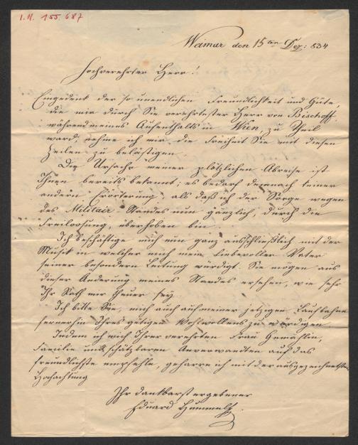 Hummel, Eduard: Brief an Ignaz Rudolf von Bischoff. Weimar, 15.12.1834