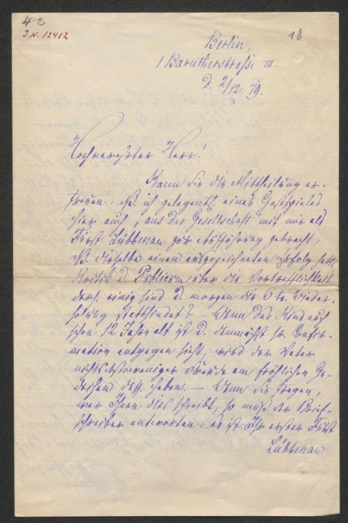 Jendersky, Karl Hermann von: Brief an ... Bauernfeld. Berlin, 2.12.1879