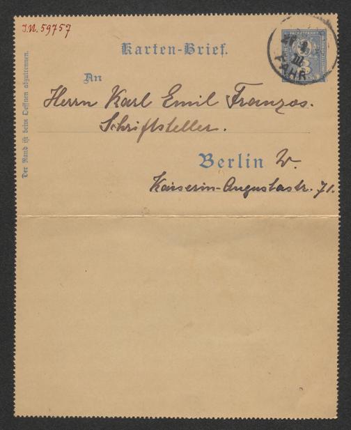Karsten, Paula: Kartenbrief an Karl Emil Franzos. Berlin, 27.2.1899