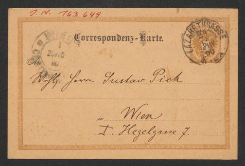 Komzák, Karl: Korrespondenzkarte an Gustav Pick. Wien, 28.10.1890