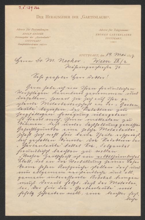 Kröner, Adolf: Brief an Moritz Necker. Stuttgart, 14.5.1897
