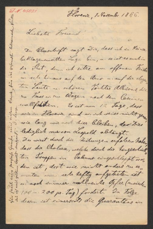 Lieben, Adolf: Brief an Moritz Hartmann. Florenz, 1.11.1866