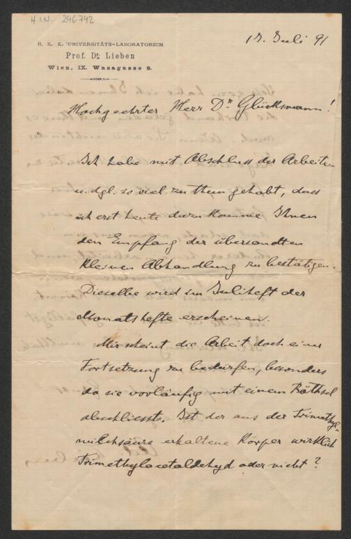 Dankt für die Zusendung einer Abhandlung über die Trimethylmilchsäure und kündigt deren Erscheinen im Juliheft der "Monatshefte für Chemie" an, weiters ersucht er Glücksmann um eine Fortsetzung der Arbeit, "denn es wäre doch schade, wenn uns ein anderer hineinarbeitet"