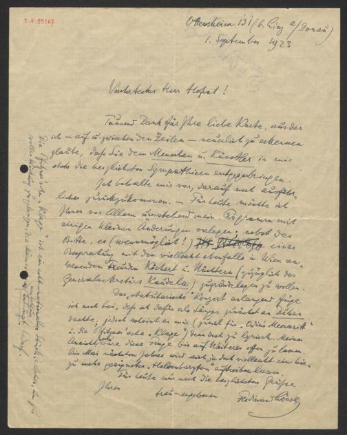 Löwe, Ferdinand: Brief an Gustav Huber. Ottensheim, 1.9.1923